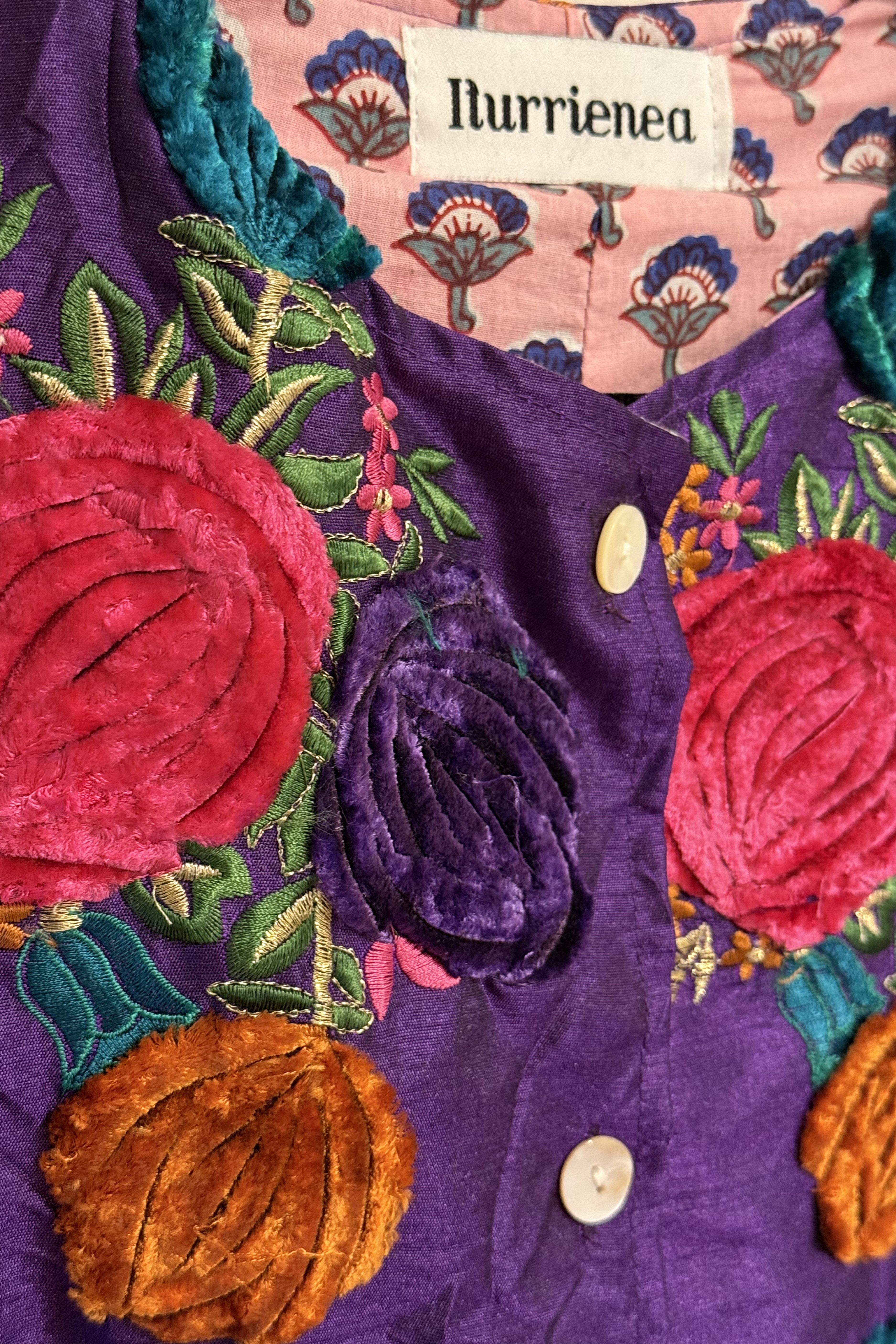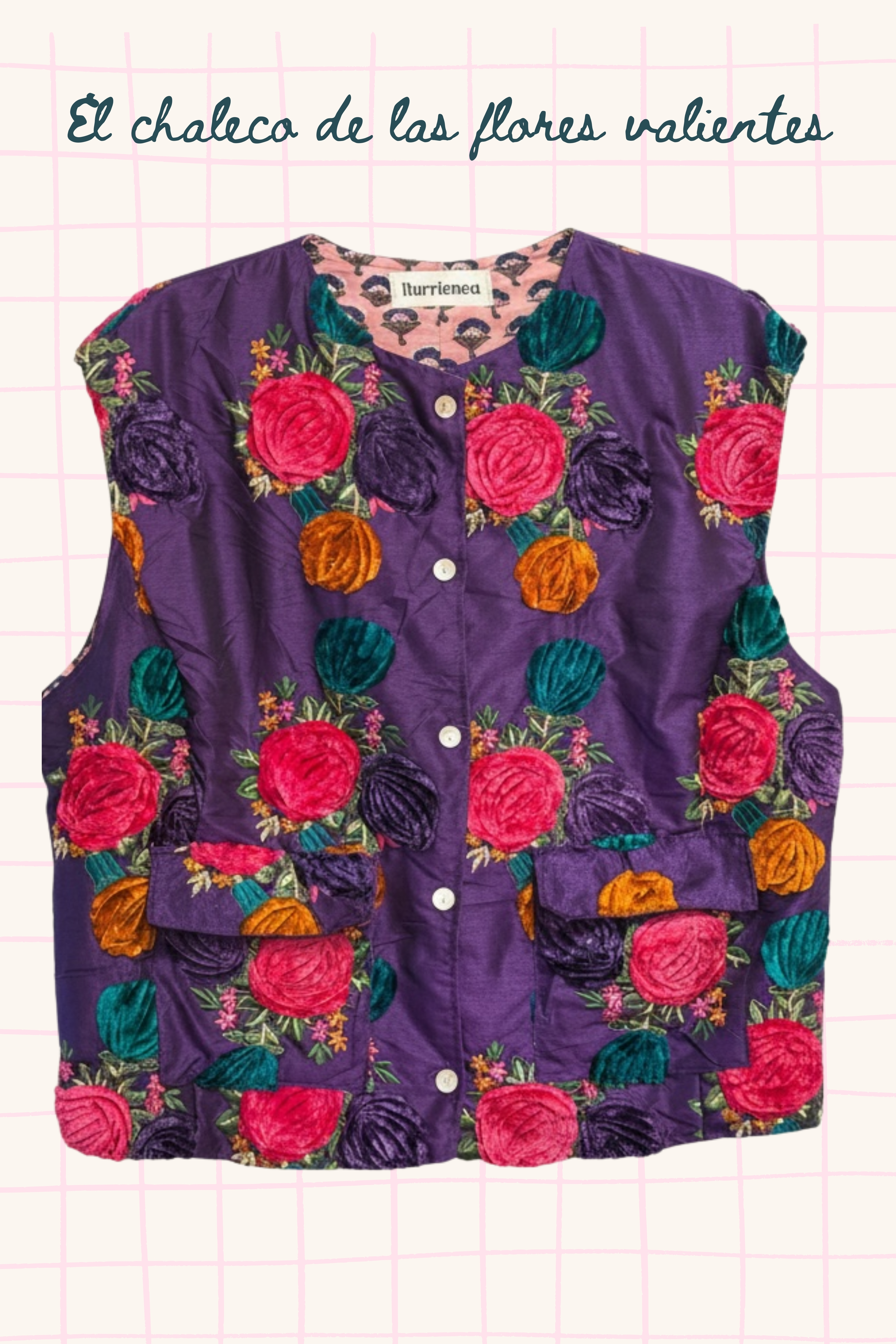 This vest has that effect. The embroidered flowers are not discreet, but they are not trying to be: they simply appear where they want, turning a simple piece into something that suddenly catches the eye.
