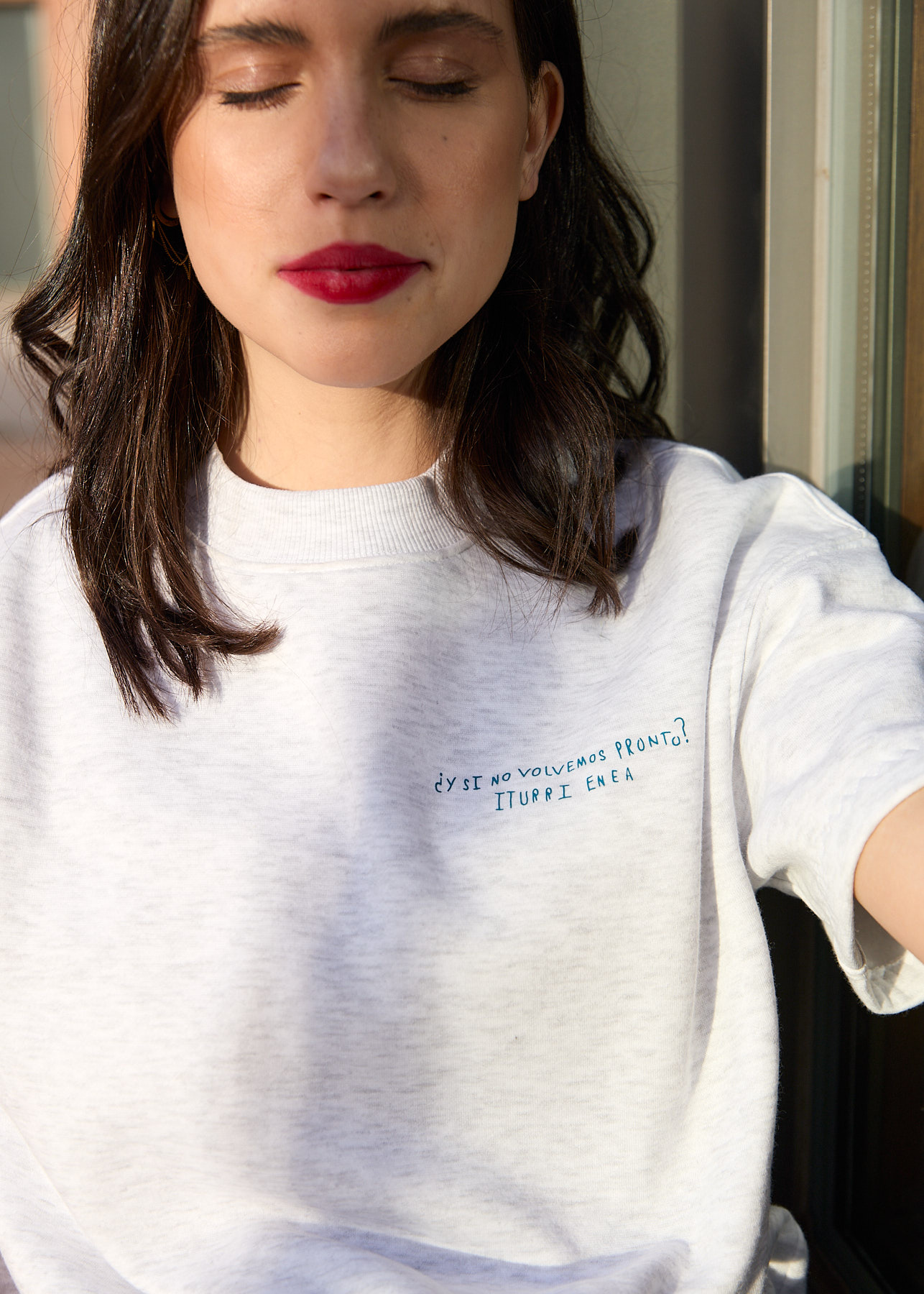 Esta sudadera de manga corta se pone con la misma facilidad con la que uno decide salir un momento… y acabar volviendo bastante más tarde. Tiene un corte cómodo, un tejido suave y una frase estampada que dice en voz baja lo que a veces pensamos al salir de casa: